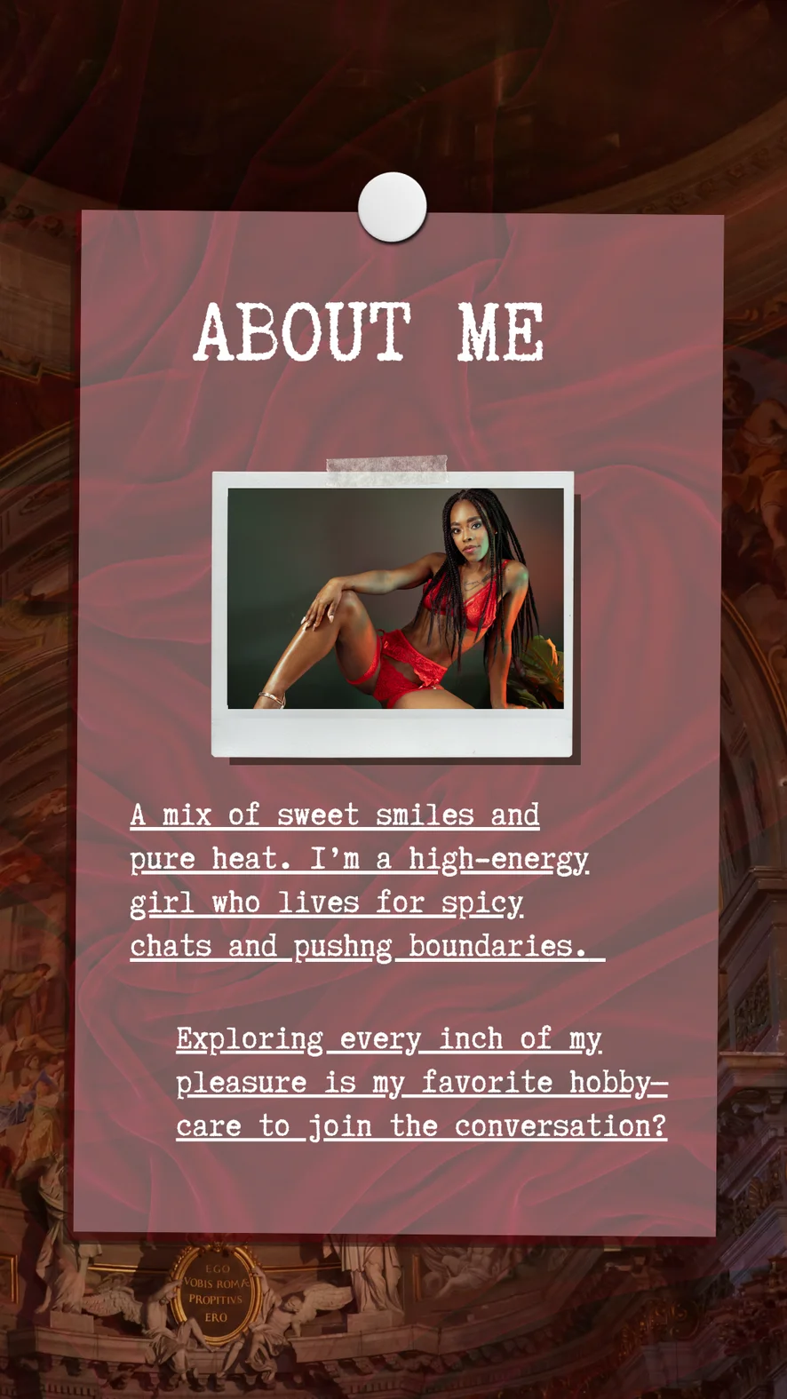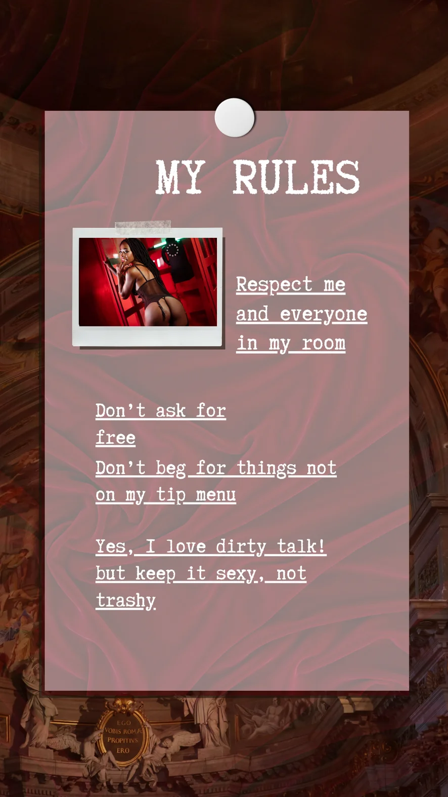 도기 스타일, 핑거링, 자위, 에로틱 댄스, 섹스 기구, 핸드잡, 음란한 대화, 상의탈의, 트월킹, 블로우잡, 마사지, 아헤가오, 페이스씨팅, 플래싱, 젖치기, 치마속, 딥스로트, 크림파이, 풋 페티시, 풋잡, 하드코어, 하이힐, 젖소, 스팽킹, 딜도 또는 바이브레이터, 스트립쇼, 오일 쇼